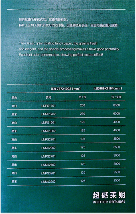Linen paper series adopt premium woodfree paper as base paper,then processed with special grains,smooth to touch,fresh to look. It can be widely used for making advertising posters, exquisite book covers、banners、 painting albums、picture albums、high-end brochures、high-end interlings,etc.